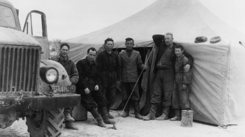 На фото: Зоогруппа Кзыл-Ординской противочумной станции в полевой экспедиции (1-7 апреля 1961 г.) обследует природные очаги чумы. Слева: Петр Климкин, шофер; Давид Генис, врач облсанэпидстанции; техники ПЧС Анес и Абдулла; Чижевский Владимир Сергеевич, зоолог, начальник зоогруппы; Жакслык, рабочий. Участки Окпанды (колхоз "Сталина") и Ак-Тюбе (колхоз "Ленина"), Сырдарьинский район, Кызылкум. Фото Д. Гениса.