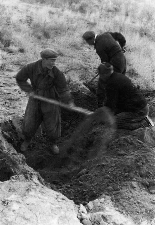 На фото: В поездке с зоогруппой Кзыл-Ординской противочумной станции. Раскопка колонии большой песчанки в поисках зимнего гнезда. Участок Ак-Тюбе, 6 апреля 1961 г. Фото Давида Гениса.