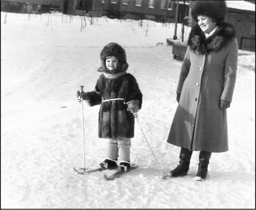 На фото Лёля под присмотром Любы катается на лыжах. Снегу в Надыме много, зима долгая, катайся сколько хочешь! Снимок сделан в 1991 году.