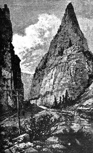 Стоявший уже у платформы поезд поразил меня своим составом: два паровоза и всего три вагона, из которых один багажный. Оказывается, что пускаться иначе на трудный перевал невозможно: от самого Маниту начинается непрерывный подъем, о крутизнах и поворотах которого европейские путешественники не имеют и понятия. Непосредственно от станции пошли без перерыва мосты и туннели, а окружающая местность поражала своим диким величием. Несмотря на необходимость преодолевать множество природных затруднений, полотно дороги устроено весьма скромно. Мосты везде деревянные и имеют вид временных сооружений, причём просто со страхом взираешь, как такой мост выдерживает тяжесть двух паровозов. Туннели оставлены совершенно в том виде, в каком они оказались после порохострельных работ. Стены нигде не облицованы искусственно и представляют грубые неровности с острыми камнями, за которые того и гляди заденут вагоны. Высунуть голову из окна положительно опасно.