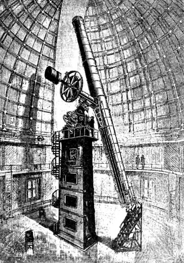 После нашего пулковского 30-тидюймового рефрактора, здешний 36-тидюймовый не поразил меня своими размерами, а внутренняя обстановка башни даже гораздо скромнее, но зато я нашел тут не мало весьма интересных особенностей, о которых считаю необходимым дать хоть некоторое понятие. Начать с того, что пол башни подвижный, т. е., по желанию наблюдателя, может подниматься и опускаться, так что тут нет надобности иметь особые лестницы, на которых наблюдателю всегда неудобно и не всегда безопасно. Так как полная длина трубы, укрепленной по своей середине, более 8-ми саженей (674 дюйма), то пол поднимается снизу на целых четыре сажени. Движения пола не требуют никаких усилий: наблюдатель нажимает лишь кнопку; ток от электрической батареи действует на клапаны труб гидравлического механизма, и пол плавно и медленно поднимается или опускается. Движение столь покойно, что, стоя на полу, его трудно даже заметить; оно видно лишь по кажущемуся движению стен и основного столба рефрактора. Столб имеет прямоугольное сечение в 10×16 футов и 37 футов высоты. Он пустой внутри, и в нём помещается часовой механизм для вращения трубы сообразно суточному обращению небесного свода. Столб составлен из шести отдельных частей, соединенных болтами. Обращая мое внимание на это обстоятельство, г. Гольден заметил, что столб пулковского рефрактора составлен только из трех частей. Здесь же, в виду невозможности доставки по горной дороге больших тяжестей, по неволе пришлось сделать его из большого числа отдельных частей.