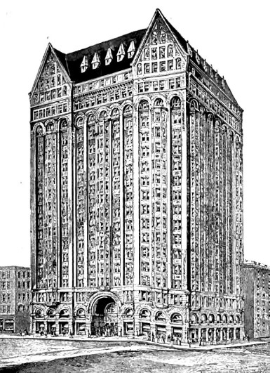 Самые высокие здания в Чикаго суть: храм масонов (Masonic Temple) в 20 этажей и высотою 265 футов и гостиница Аудиториум (Auditorium), которую американцы сравнивают — excusez du peu — с древним римским колизеем. Здание Аудиториума обошлось в 3 500 000 долларов и имеет всего 10, но высоких этажей. Кроме гостиницы с 400 нумеров, из которых многие в несколько комнат, тут помещается еще театр на 12 000 зрителей. Высота собственно дома 144 фута, но на улицу Конгресса (Congress street) здание имеет башню, вершина которой на 260 футов выше мостовой. Наверху устроена зала, из окон которой открывается обширный кругозор во все стороны, но, однако вдаль не видно: над городом стоит постоянная мгла дыма, а над озером — вечный туман.