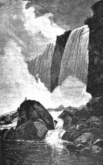 Получив в проводники рослого американца, я вышел из домика и начал спускаться по винтовой лестнице, устроенной внутри деревянной башни, примкнутой к обрыву скал Козьего острова. Дорогою я считал ступеньки, их оказалось 185. Из нижних дверей башни я вышел на край обрыва над самою пучиной, где соединяются воды обоих водопадов. Здесь мы осторожно двинулись прямо к Центральному водопаду, который ревет и над головою, и под ногами с оглушительною силой. Вдоль обрыва имеются сперва перила, и для удобства переброшены кое-где доски. Но вот проводник взял меня за руку и потащил в самый водопад. Видя, что перила прекратились, и чувствуя, что мне не хватает воздуха, нечем дышать, я хотел остановиться и передохнуть, но проводник ничего не слышит, да, понятно, и не может слышать… он тащить меня вперед по мокрому, скользкому и наклонному карнизу скалы. В глазах у меня помутилось, и я ничего уже не видел; вода крупными и частыми струями лилась, как в душе, и сверху, и снизу. Проводник прижимает меня к скале и медленно подвигается боком, спиною к водопаду. Мы вошли в Пещеру ветров (The cave of the winds). Сообразив свое положение, я вскинул глаза кверху и сквозь мглу воды увидал черную скалу справа и водяную стену слева. Верхняя часть этой стены просвечивала слабым зеленоватым цветом, ниже — одни брызги целого потопа. Дышать нечем: вместо воздуха — одна водяная пыль. Держаться не за что: по скале струится вода, пол пещеры тоже совершенно мокрый и с наклоном наружу, прямо в пучину. Положение довольно неприятное и опасное. Единственная опора — рука проводника, но если он сам поскользнется? Я закричал, но не услышал собственного голоса…