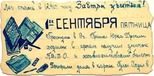 Четвертый урок русский язык Павел Васильевич объяснял программу русского языка на учебный год. Пятый урок был черчение. На улице дождь. Мы с Юркой сняли обувь и шли до дому босиком.