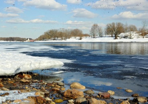 На улице мелкий дождь, сильный ветер. +4. Снег на тротуаре не растаял, иду по снежной кашице или лужам.