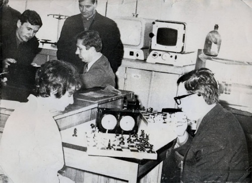 На фото: 19 Март 1972 г. Тюмень. Шахматный блиц-турнир ХТФ. На переднем плане Щипанов и Озеранская, я (слева) играю с Н.К.Ивановым.