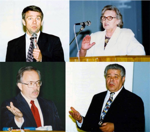 На фото: Томск. 21.05.1996 г. 10-е совещание по проблемам ТНХК. Выступают (вверху) директор института катализа СО РАН В.Н.Пармон, директор института химии нефти СО РАН Е.Е.Сироткина, представитель фирмы «Дюпон» Э.Роуз, руководитель химического направления концерна «Биопроцеесс-Нипек» А.С,Чеголя.