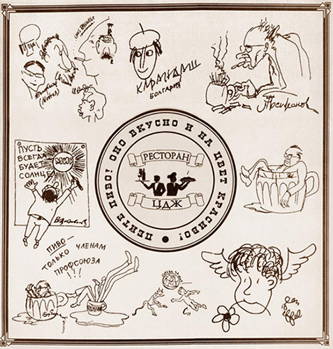 На стенах – рисунки Эффеля, Бидструпа, Бор. Ефимова. Бидструп и БЕ оба нарисовали себя тонущими  в пивных кружках: у первого  – быстрый точный автошарж, у второго – явно привыкшего работать с ластиком и калькой, – голова и ноги торчат сами по себе, не имея под пеной ни туловища, ни зада. Как же ясно всё понимаешь в сравнении!