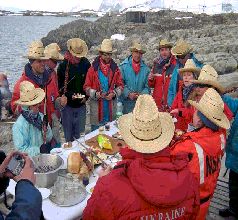 Потом пошли к костру, туда же уже подошли питерманцы, причем Мелисса мне по секрету шепнула, что они готовят сюрприз, и по этому поводу я оказал небольшую техническую помощь. Мелисса привезла с собой iPod с музыкой и специальные колоночки к нему, я все это расположил недалеко от стола и подключил, так что музыку в этот раз заказывали (и исполняли;)) гости. И вот наконец после некоторого ожидания и парочки аперитивов мясо было готово и наступило время для сюрприза! Из огромного мешка были извлечены ковбойские шляпы и шейные платки, плюс настоящее ковбойское лассо, на плеере включили кантри – в результате получилась ковбойская пати. Вите была выдана настоящая жилетка со звездой шерифа и надписью «Шериф станции» – в его обязанности входило следить за порядком на вечеринке:) Потом уже Мелисса мне призналась, что все это мероприятие было задумано еще в сентябре и весь реквизит был уже давно завезен, ждали только подходящей вечеринки. Кстати, мой гавайский костюм – это остатки от прошлогодней вечеринки, которая в прошлом году проходила в гавайском стиле:) В этот раз все учились бросать лассо, танцевать ковбойские танцы под музыку кантри и кричать «Ййооо-Хоооо!». Я в это время развлекал Синдиллу, даже в нарушение всяких антарктических правил мы пошли кормить скуев неподалеку – ребенка впечатлило, когда эти огромные птицы осторожненько бочком подходили и брали у нас пищу из рук:) А потом Синдилла сделала мне совершенно неожиданный подарок – за то, что я с ней все время играл, мне была преподнесена великолепная австралийская футболка с национальными узорами:)