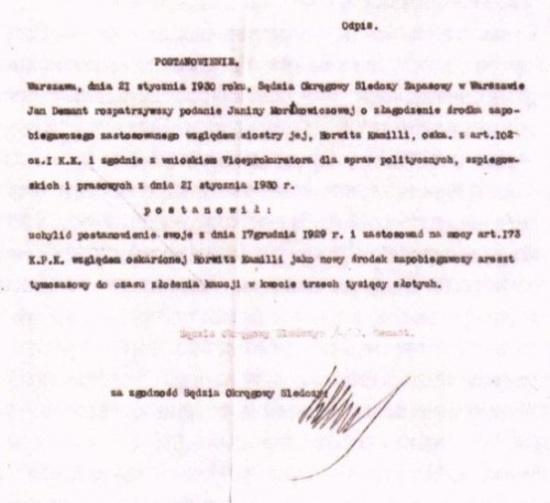 На фото: Свидетельство об освобождении Камиллы Горвиц из предварительного заключения под залог в размере трех тысяч злотых