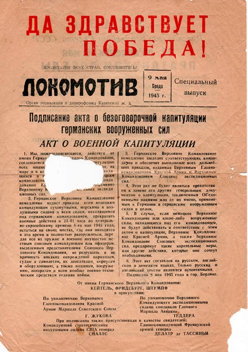 Рано утром 9 мая дежурная оператор услышала, что объявлена Победа, подписан акт капитуляции. Она выбежала на улицу и, постучав в дверь ближайшего дома, сообщила эту новость и попросила передать эту новость другим.