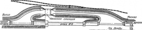 Немало хлопот доставил строителям однокамерный шлюз № 3 у ст. Яхрома Савеловской ж. д. Дело в том, что здесь, в районе стройки, был весьма высокий уровень грунтовых вод — 12 м и выше днища шлюза. Вода быстро поступала из протекающей в непосредственной близости р. Яхрома, отделенной от котлована шлюза аллювиальными разнозернистыми песками с прослойкой гравия и гальки.