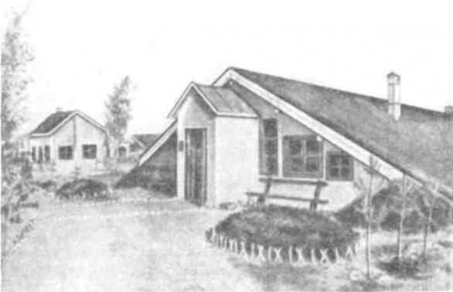 Вспоминая сейчас все стройки, на которых мне до или после этого приходилось участвовать, не могу назвать более сложной обстановки, если не считать, конечно, строительства оборонительных рубежей в прифронтовой полосе. Выход был найден совершенно необычный для строительной практики. Сотни людей день и ночь плели из прибрежного ивняка щиты, которые устанавливались на деревянном каркасе с плотной забивкой пространства между щитами талой глиной, добываемой из-под почти двухметрового слоя мерзлого грунта. Таким образом создавалась верхняя половина стены. Остальная часть заглублялась в землю с закреплением стенок одним слоем этой же плетенки. Скудные ресурсы леса шли только на каркас (из подтоварника) и на пологие кровли. По тесу внахлестку укладывался одни слой толя, потом шлак и слой мелко трамбованной земли и, наконец, — дерн. Такая кровля, как показала практика, вполне водонепроницаема.