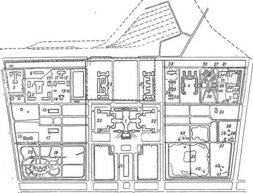 Вспоминая сейчас это грандиозное сооружение на Ленинских горах, не могу не привести хотя бы самые краткие данные о нем. Площадь, отведенная для расположения объектов МГУ, составляет 167,4 га и представляет собой прямоугольник, вытянутый с северо-запада на юго-восток почти на 2000 м и шириной в 850 м. На этой площади были сооружены: главный корпус МГУ, корпуса факультетов физики, химии, биологии и почвоведения. Для биолого-почвенного факультета предназначены также корпус климатологии, виварий, экспериментальные теплицы, вегетационные домики с фотопериодическими камерами, почвенный стационар и 20 экспериментальных прудов для рыбного хозяйства. Комплекс зданий механики спроектирован из 6 отдельных корпусов-лабораторий. 38 отдельно стоящих зданий предназначены под факультетские лаборатории, 16 зданий — это хозяйственные помещения, 1 — административное, 2 — спортивных, 11 — санитарно-технических и энергетических сооружений. Здесь же создан и агроботанический сад. Объем всех построенных за этот период новых зданий МГУ составляет 2 718 590 м3. (Для сравнения: объем Исаакиевского собора в Ленинграде — 340 тыс. куб. м). Полезная площадь равна 398800 кв. м, в том числе: учебно-научная — 125 810 кв. м и жилая — 64 020 кв. м. Во всех зданиях МГУ насчитывается 37 000 помещений, аудиторий и лаборатории — 1855. За последние годы на той же территории построены новые учебные корпуса в современных конструктивных решениях. Главный корпус в высотной своей части возведен на коробчатом железобетонном фундаменте, опирающемся на естественное основание из плотных суглинков, с несущим стальным каркасом в центральной и 18-этажных частях корпуса. Заполнение каркаса (наружные стены) в основном из многодырчатого кирпича с облицовкой цоколя гранитом и выше цоколя — керамическими плитами. Для корпусов факультетов приняты ленточные бетонные и бутобетонные фундаменты; несущие стены — кирпичные с почти такой же облицовкой (корпус биолого-почвенного факультета отделан терразитовой штукатуркой светлых тонов). Внутренние стены и перегородки как главного корпуса, так и зданий факультетов выполнены из несгораемых материалов (кирпич, гипсовые плиты, пустотелая керамика). Перекрытия зданий — из сборного и монолитного железобетона. Иллюстрация: Генеральный план сооружений МГУ: 1 — главный корпус; 2 — физический корпус; 3 — химический корпус; 4 — биолого-почвенный корпус; 5 — корпус № 19; 6 — административный корпус; 7 — гараж; 8 — котельная; 9 — типография, прачечная, столовая; 10 — мастерские физического факультета; 11 — корпус высоковольтных установок; 12 — трансформаторная подстанция; 13 — фильмохранилище; 14 — криогенный корпус; 15 — корпус № 20; 16 — спортивный павильон (манеж); 17 — спортивный павильон (трехзальный); 18 — астрономическая обсерватория; 19 — павильон 70-см рефлектора; 20 — солнечный павильон; 21 — бассейн; 22 — центральная распределительная подстанция; 23 — корпус № 132; 24 — корпус сверхвысоких давлений; 25 — корпус газовой электрохимии; 26 — экспериментальные теплицы; 27 — вегетационные домики и фотопериодические камеры; 28 — лаборатория искусственного климата; 29 — вегетационные домики почвенного отделения; 30 — виварий; 31 — корпус гидрологии; 32 — корпус института механики; 33 — компрессорная; 34 — метеорологическая станция; 35 — водохранилище; 36 — почвенная лаборатория; 37 — теплицы н