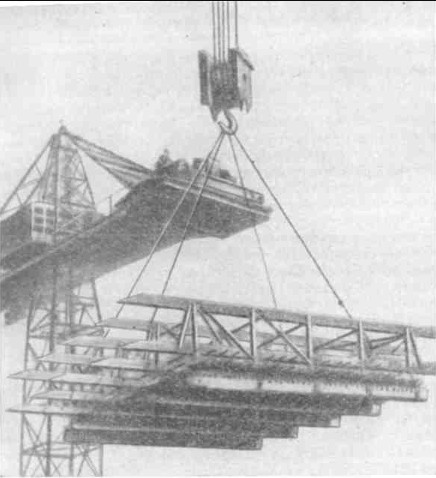 Фото: Установка арматурного каркаса верхней плиты коробчатого фундамента главного корпуса с прикрепленным снизу инвентарным щитом опалубки Характерной чертой сооружения коробчатых фундаментов с метровой толщиной вертикальных стен было широкое применение армокаркасов с заранее укрепленной на них инвентарной сборнощитовой опалубкой, а также использование жесткой арматуры в виде стальных полос крупного профиля. Это решение себя полностью оправдало. Армирование и бетонирование нижней плиты и стен этого фундамента по своим масштабам и некоторым приемам (проектированием фундаментов руководил инженер Б. П. Джишкариани) напоминало мне работы по сооружению днища и стен шлюзов канала Москва — Волга. Разумеется, на строительстве МГУ эта работа шла организованнее, более индустриально, со значительно меньшими трудозатратами. Опыт сооружения этих крупных фундаментов показал, что закрепление щитовой опалубки на арматурном блоке до его опускания в котлован и монтаж опалубки вместе с монтажом арматурных каркасов значительно облегчали работу. Этот метод может быть рекомендован для широкого внедрения в практику строительства. Использование полосовой стали различных сечений в качестве жесткой арматуры для крупных железобетонных элементов выгодно тем, что она зачастую менее дефицитна, чем круглая большого диаметра, легче сваривается и удобна в монтаже. Опыт показал далее целесообразность установки основных монтажных кранов до возведения фундаментов или в самом начале этих работ. Краны значительно облегчают сооружение фундаментов. Серьезным (весьма нередким на строительствах) упущением была недостаточно тщательная вертикальная гидроизоляция на отдельных участках стен фундаментов. В результате грунтовые воды стали проникать в подвальные помещения. Пришлось вскапывать пазухи и заново переделывать изоляцию на этих участках. Ряд переделок вызвала также некачественная изоляция в местах пересечения стен фундаментов трубными коммуникациями, где тоже было обнаружено просачивание воды в помещение. Этот горький опыт еще раз учит, что устройство гидроизоляции должно находиться под неустанным надзором производственного персонала и выполниться очень тщательно, даже если и нет грунтовых вод в период строительства. Ведь и при сухом котловане весьма вероятно проникновение дождевой и талой воды по стыку фундамента с обратной засыпкой пазух. Разные способы подачи бетона на укладку, примененные при сооружении фундаментов, еще раз подтвердили, что наиболее рациональна подача бетона в автосамосвалах с выгрузкой непосредственно в бетонируемый блок, минуя всякую промежуточную тару (бадьи, бункера и т. д.) и промежуточный транспорт (краны, транспортеры и т. д.). Для организации непосредственной подачи бетона при достаточных его объемах единовременные затраты на устройство мостов, эстакад и т. п. для пропуска автосамосвалов являются целесообразными. |