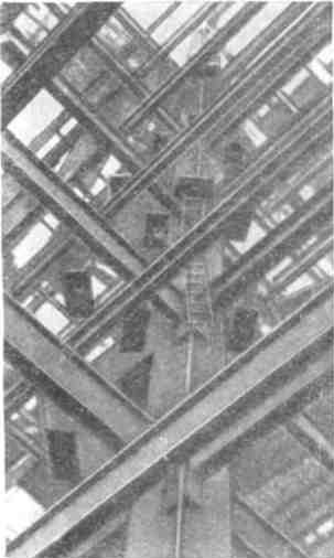 Заготовка стальных конструкций, монтаж и сварка элементов каркаса главного корпуса производились трестом Стальконструкция. Сравнивая ряд известных мне примеров монтажа крупных сооружений из металлоконструкций, я должен отметить исключительную четкость организации, глубокую инженерную продуманность всех монтажных операций. Весь монтаж 37,5 тыс. т металлических конструкций каркаса главного корпуса, состоявших из 71 тысячи основных элементов, был завершен за 22 месяца. В отдельные месяцы монтировали до 4 тыс. т металлических конструкций при нагрузке на один башенный кран до 2,5 тыс. т в месяц. Применение в каркасе высотной части главного корпуса оригинальной конструкции колонн крестового сечения с поворотом полок к основным осям здания под углом 45° наряду с преимуществами в конструктивном и статическом отношениях облегчило монтаж, дало значительную экономию средств. Заметим, что стоимость одной тонны колонн крестового сечения, изготовленных для здания МГУ на заводе имени Орджоникидзе, примерно на 10% меньше стоимости колонн двутаврового сечения, изготовленных Днепропетровским заводом для каркаса высотной части здания на Смоленской площади. Ускорению монтажных работ весьма способствовала своевременная организация хорошо оборудованного склада металлических конструкций непосредственно возле строящегося объекта. При монтаже каркаса главного корпуса была успешно применена подача металлоконструкций под монтажные краны на железнодорожных платформах, доставляемых мотовозом по эстакадам прямо в корпус. Сокращение перегрузочных операций и удобство транспортирования полностью оправдали дополнительные расходы на устройство деревянных железнодорожных эстакад. Серьезный и остроконфликтный технический вопрос возник в связи с требованием пожарного надзора взять все металлические элементы в бетонные футляры. Проект этой «обетонки» металлоконструкций уже был составлен, причем естественно, что бетон не учитывался в статических расчетах армокаркаса и резко утяжелял здание. Кроме того, предполагались весьма сложные работы по дополнительному армированию вокруг стальных элементов, устройству опалубки и заполнению бетоном, по существу, щелевых полостей между опалубкой и стальными элементами. С требованием обетонирования стальных конструкций, целиком заключавшихся в дальнейшем в кладку или облицовку, я встретился впервые. Мне это казалось совершенно необоснованным, в чем я и убедился, ознакомившись по литературе с опытом строительства высотных зданий в США. Короче говоря, после серьезного обсуждения вопроса коллективом проектировщиков и строителей мы категорически отказались выполнить это требование и распорядились начать кладку стен без обетонирования стальных элементов. По мере роста кладки конфликт затихал. Строители оказались правы. |