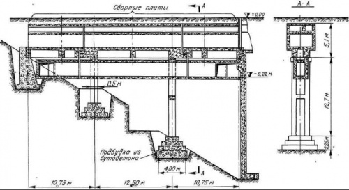 Следует иметь в виду, что самое тщательное уплотнение практически не исключает последующей осадки грунта. А это влечет за собой повреждение бетонных площадок, дорог и, что самое страшное, нарушение ответственных коммуникаций, пересекающих засыпанные пазухи. В конечном счете пришлось коммуникации пропускать по сборным железобетонным эстакадам (см. рисунок), опирающимся на основной грунт, и оставлять эти эстакады внутри засыпки.