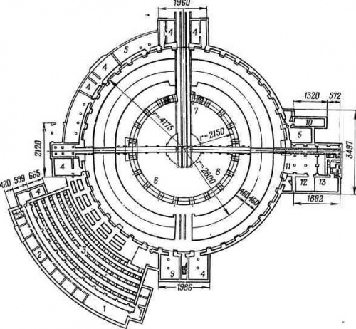 Иллюстрация: Синхрофазотрон на 10 Гэв Объединенного института ядерных исследований (г. Дубна). План цокольного этажа: