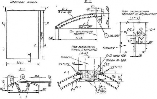 Учитывая весьма большой диаметр кольцевого магнитного зала и соответственно периметр его стен, правильный выбор их конструкций имел большое значение. Во-первых, стены должны принять значительное давление (до 8 т/м2) грунтовой обваловки, выполнявшей функции биологической защиты от излучения. Во-вторых, следовало думать и о стоимости этой биологической защиты. При большой протяженности магнитного зала выигрыш в стоимости вносил существенный вклад в общую экономическую эффективность конструкции зала в целом. Наконец, требовалась максимальная индустриализация работ. Вариант монолитных железобетонных стен был отвергнут, как неиндустриальный, требующий большого количества опалубки и не обеспечивающий высокие темпы работ (тем более зимой). Варианты сборных плоских железобетонных ограждений также оказались неудачными, так как потребная по расчету толщина плоских сборных панелей была слишком велика. В конечном счете за основной был принят вариант стенового ограждения из тонких железобетонных панелей, имеющих корытообразную, арочную форму (см. рис.). Арочная форма панели позволила избежать значительных изгибающих напряжений в ней. Панель работала преимущественно на сжатие, что позволило, несмотря на большие нагрузки, ограничить толщину панели двенадцатью сантиметрами. При такой толщине вес одного квадратного метра панели составлял около 300 килограммов (монолитное плоское ограждение было бы тяжелее вдвое). |