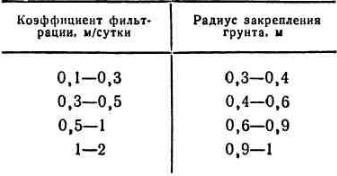 Радиус закрепления грунта вокруг одной трубы-инъектора зависит от коэффициента фильтрации грунта. Для ориентировки может служить следующая таблица: