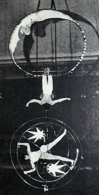 Неприятности приходят и уходят. А если и не уходят, то просто стараешься на них не обращать внимания. Жоржа мучила нога, но еще больше мучило его неуемное желание воплотить в жизнь все те необычные замыслы, которые постоянно возникали в его голове. Средний брат Жоржа, Наум, был художественным редактором «Техника — молодежи», журнала, который предоставлял в те годы свои страницы самым дерзким техническим гипотезам, самым невероятным наблюдениям и изобретениям. В одном из номеров этого журнала Жорж и прочитал статью о бескрылом полете человека. В другом — обнаружил исследование траектории перемещения мухи. Каким-то образом обе эти темы соединились у него в одну. Жорж сразу увлекся идеей перенести этот «мушиный полет» людей на манеж. Но вплотную занялся ею, как только понял, что номер, созданный на этой основе, позволит вернуть в работу выброшенные из трюкового репертуара в связи с травмой колена маховые обрывы, которые так любила Рикки. Придумал он нечто совершенно неожиданное, можно даже сказать, революционное в гимнастической работе. Все вольтижные трюки, в том числе и обрывы, Жорж решил перевести из вертикали в горизонталь. Для этого сам он должен был стоять на вращающейся площадке, прикрепленный к ней специальными замками, а на Рикки, работающую в его руках, воздействовала бы уже не сила тяготения, а центробежная сила. Как всегда, исподволь стали готовить трюковые комбинации. Начались консультации с инженерами и конструкторами, связанными с авиацией, потому что аппарат мечтали сделать не только красивым, но легким и прочным. Название придумали номеру такое, чтобы и другим было понятно и самим радоваться — «Летающие люди». Выглядел аппарат в последнем варианте на удивление просто. Легкий ажурный пирамидальный четырехметровый пьедестал, увенчанный круглой площадкой диаметром в пятьдесят сантиметров со стойкой-дугой посредине. Площадке этой предстояло постоянно вращаться во время исполнения номера, и скорость ее движения по необходимости регулировалась. Она была минимальной в первой комбинации, которая представляла из себя серию балетных поддержек и силовых акробатических трюков, завершающихся каждый раз Риккиным обрывом в руках Жоржа. Более стремительное движение площадки позволяло вторую комбинацию строить как гимнастическую. Рикки в руках Жоржа, стоящего вертикально, уперевшись в стойку-дугу, силой вращения перемещалась в горизонтальное положение, и обычные трюки воздушной вольтижировки получали в результате этого небывалый ракурс и небывалую новизну. Особую оригинальность приобретали при этом обрывы, и в первую очередь тот большой, которым решено было заканчивать комбинацию. Рикки должна была из рук Жоржа летать на штрабате, укрепленном на одной ноге, через барьер, почти что к зрительским местам. Там ей предстояло, вращаясь над головами зрителей по всей окружности манежа, крутиться еще вдоль оси собственного тела. На финал номера Рикки и Жорж надевали небольшие ранцы с крыльями-лопастями, а из вращающейся площадки аппарата выдвигались трехметровые штанги. Лежа на них, гимнасты и совершали, постоянно меняя скорость, направление и высоту, сложнейшей траектории полет. Оригинальность аппарата была еще и в том, что вся его силовая часть с мотором и редукторами была смонтирована в металлическом ящике, который 