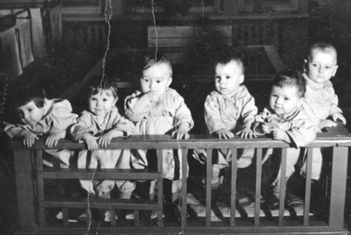 На фото: Молодые североморцы пока ещё в манеже детских ясель. Наш Виктор крайний справа.