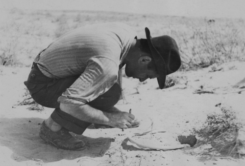 На фото: Cбор клещей в норах грызунов на фланелевый жгут в очагах геморрагической лихорадки. Кзыл-Ординская область, Чиилийский район, зона отгонных пастбищ. 60-е годы. Фото Давида Гениса.
