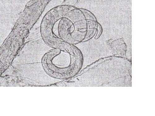 На фото: Личинка трихинеллы, выделенная из мышечного волокна. (препарат и фото под микроскопом Давида Гениса).