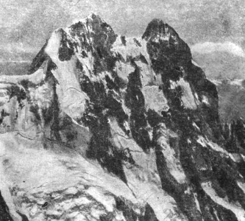 Пошли на спуск по южному гребню. Гребень не труден. Наибольшее время занял переход с гребня к седловине (спустились дюльфером[1]). На спуск от вершины затратили два часа.