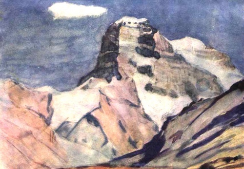 Долезли до скал. Обход невозможен. Приходится брать в лоб. Скалы трудны. Лезу на кошках. Оглянулся: за мною дальше никто не полез. Отвязался у последнего выступа и по снежному гребню взошел на вершинку высотой 5500 метров. Открылась обширная панорама.