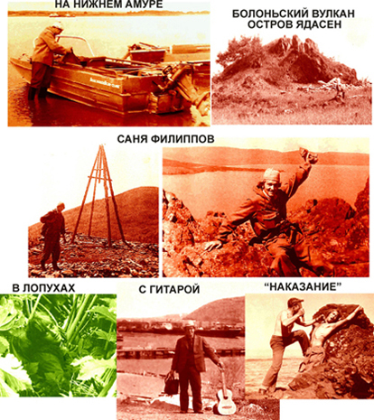 Заядлый гитарист, весёлый и немного безалаберный по натуре парень, Саша - по его собственному признанию - баловался в школе наркотой, за что его не перевели в 10-й класс, осенью его ожидала переэкзаменовка… Я взял его с собой на полтора месяца в геологические маршруты по Нижнему Приамурью, где «протащил» его в течение двух месяцев «весёлыми» маршрутами по крутым берегам Амура и его притокам – от Хабаровска до самого устья, где мы сплавлялись и «отрабатывали» также короткие его притоки. Проплыли на попутном транспорте и прошли, карабкаясь по склонам почти 1000 км… Находили время и подурачиться (см. фото наших «постановочных и хулиганских» кадров, сделанных встреченными на берегу рыбаками. Любили, однако, мы пошутить…