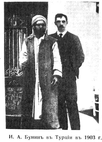 Есть фотография тех дней: Бунин снят с двумя суданскими неграми: один в низкой феске, другой в каком-то непонятном головном уборе, а сзади них, положив руки им на плечи, стоит он -- в темном костюме, в мягкой белой рубашке с длинным галстуком, без шляпы. Причесан на косой ряд, узенькая прядь на лбу, худой с очень серьезными глазами.