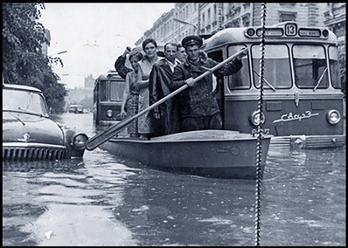 Фотографироваться дядя Миша не любил – на всех семейных снимках он всегда с краю, заслонён чьими-то спинами. Его фотографию я вдруг нашёл в интернете совсем недавно – про жуткий ливень, 25 июля 1965 года затопивший Трубную, Неглинку и Цветной бульвар, где дядя Миша оказался, возвращаясь с работы, он часто рассказывал – как его и других вывез на лодке молодой солдат. На фото дядя Миша в чёрном плаще – невозмутимый, как всегда, а солдат выглядит не Мазаем – Хароном.