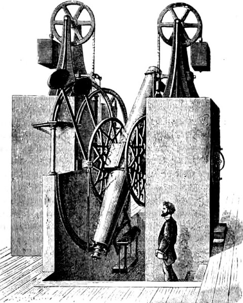 Так называемый большой рефрактор Гринвичской обсерватории (южный экваториал) — это небольшая, сравнительно, труба Мерна с объективом 12,8 дюйма в диаметре и длиною 17 футов. Особенность этой трубы заключается в том, что составляющие стекла объектива, кронглас и флинтглас, вделаны не неподвижно, но могут раздвигаться и устанавливаться так, что в одном положения рефрактор действует, как зрительная труба, а в другом — как астрограф. Микрометрический прибор при окуляре замечателен тем, что показания на барабанах винтов не отсчитываются и не записываются наблюдателем, а прямо печатаются на бумажной ленте, для чего головка микрометрического винта снабжена рельефными цифрами, на которые накатывается печатная краска. Это новое и остроумное приспособление изобретено нынешним директором Кристи.
