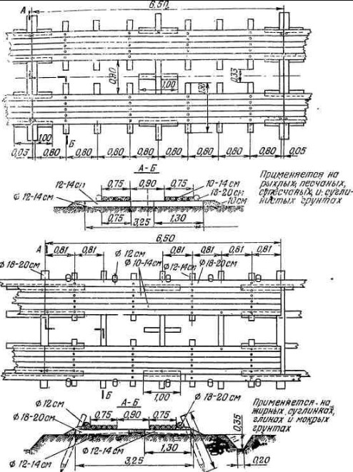 Дороги эти делались в ряде случаев весьма капитально из обапол или даже бруса с металлическими креплениями скобами, а в отдельных случаях и болтами. Наиболее распространенный при строительстве канала тип такой дороги приведен на рисунке. В своей книге «Подготовительные работы на крупных строительствах» (Энергоиздат, 1959) я привожу подробное описание различных, наиболее рациональных типов временных деревянных дорог, именовавшихся тогда в общей форме «лежневыми дорогами». Сейчас упоминаю об этом потому, что до сих пор перед строителями часто встает вопрос о способе устройства временных дорог к строящимся объектам.
