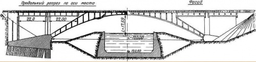 В нашей стране этот мост являлся наибольшим по своему пролету, а во всем мире — одним из крупнейших железобетонных арочных мостов. Сама схема моста, простая по своей композиции, очень интересна и в эстетическом отношении (см. рис.). Кроме того, при сравнении ряда проектов выявилось, что помимо преимуществ технического и эстетического порядка построенный нами мост дал экономию в 900 тысяч рублей по сравнению с наиболее дешевым из конкурирующих вариантов.