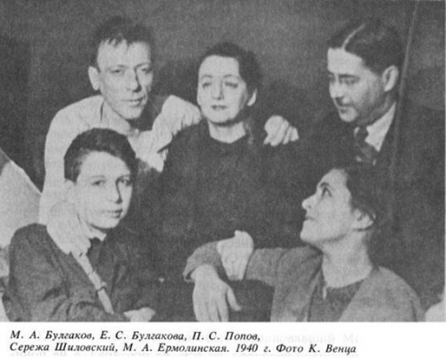 На фото: М. А. и Е. С. Булгаковы, П. С. Попов, Сережа Шиловский, М. А. Ермолинская. 1940 г. Фото К. Венца.