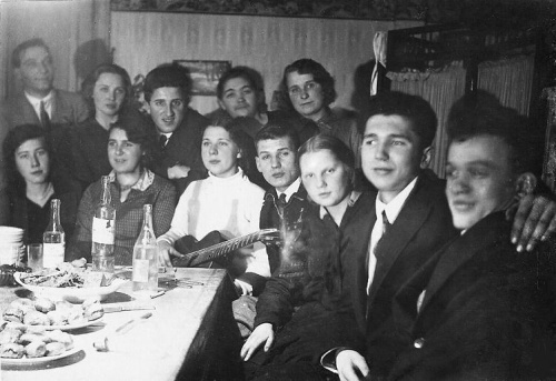 На фото: На вечере. Сидят слава направо: Надя Черкасова, Галя Суббота, Шура Васильева, Лёша Морозов, Маня Бычкова, Михаил Суббота, Володя Леонов. Стоят: Ваня Сидоркин, Зина, Исаак Штонбок, Валя, Маруся. Фото 3 января 1933 года.