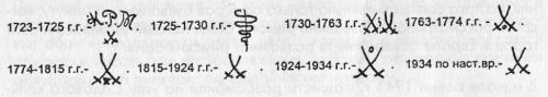 На фото: Эволюция фирменных знаков знаменитого мейсеновского фарфора с 1723 г. по настоящее время.