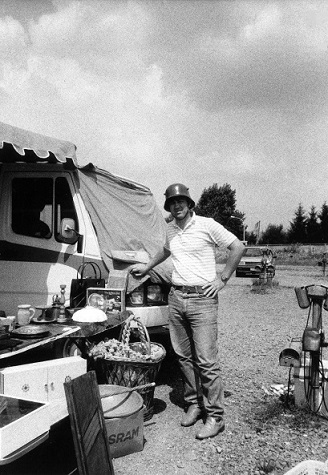 По выходным, то в одном месте, то в другом, устраиваются «блошиные рынки». Здесь это называется «флёмаркт». Побывал я на одном, увидел много интересного. Продаётся много разных старых вещей, больше для коллекций, чем для практического использования. Старые открытки, фотографии, да что угодно. Видел старую, времён первой мировой войны, немецкую железную каску с рожками. Попросил у хозяина сфотографироваться, тот не возражал. Продавцы, в основном, старики. Видел, правда, и американского молодого военного, в гражданке, конечно, но всё выдаёт в нём американца. Здесь их много на американских военных базах. Он продавал американские фотоплёнки «Кодак». Видно, не гнушаются американцы заниматься мелкой коммерцией.