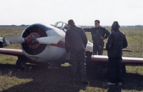 на фото: - Як-52 после посадки без шасси – аэр.Васильевка – 1997г.