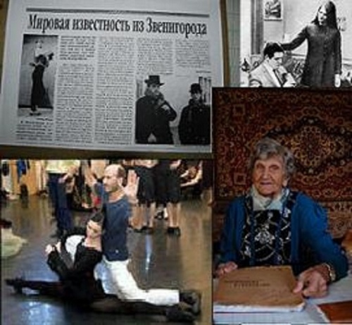 На фото. Вверху: слева звенигородская газета, где Леонид Мясин рядом с Сергеем Дягилевым, справа - Татьяна Мясина в фильме "Журналист". Внизу: Лорка (Леонид Леонидович)Мясин на репетиции постановок балетов отца в Большом театре, справа - Евгения Михайловна Закуваева (Мясина) последняя хозяйка дома на Мясиной горе в Звенигороде.
