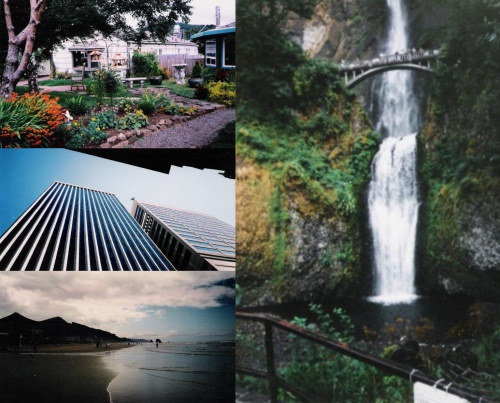 На фото США верху слева - Штат Орегон - городок на побережье; слева в середине - Балтимор - устремление в небо; слева внизу - Тихий Океан; справа Штат Орегон - водопад на побережье.