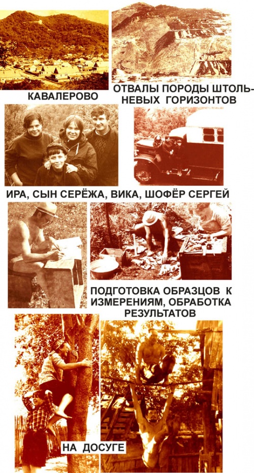 …Постепенно потекли рабочие будни. Кроме непосредственной работы, в соответствии со своими пристрастиями и личными талантами, каждый вносил свой вклад в общее дело и в части бытовых проблем. Так, например, когда надо было добыть дефицитный лейкопластырь (на котором писали номера и который клеили на измеряемые штуфы образцов), в аптеку откомандировывался наш главный «ходок» Юра Васильцов. Своим шармом заядлого мачо этот пронзительно «жгучеглазый» брюнет «обезоруживал» аптекарш и фельдшерицу, и те откуда-то привозили этот тогда дефицитный товар. Когда надо было достать молоко у немногочисленных в посёлке держателей коров, на поиски отправлялся наш сероглазый и блондинистый Лёша Кудряшов – ему почему-то благоволили поселковые молодицы – домашние хозяйки. По хозделам (найти в посёлке умельца починить дымящую печь, залатать текущую крышу) любила отправляться Ира. Эта крупная жизнерадостная девушка производила самое наилучшее впечатление даже на явных мужиков-пропойц, которые старались споро справиться с заданием… Ну и, конечно, когда надо было договариваться с начальством рудника о допуске нас на опасные по «заколам» и обвалам участки старых заброшенных выработок, в кавалеровский ХГОК ехал я - на своей красной машине, в шляпе и с портфелем – как «важный представитель науки»…