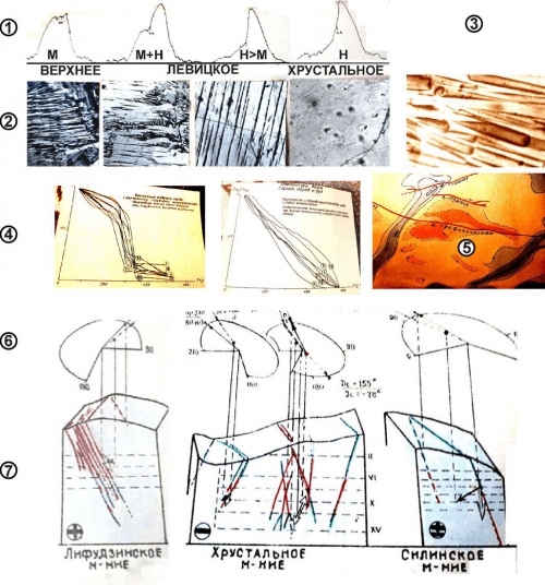 На рисунках в коллаже фото перед текстом главы помещены отдельные фрагменты графики к диссертации. 1, 2 – соотношение моноклинной и гексагональной фаз в пирротинах по данным рентгено-структурного и минераграфического анализов: 1 –дифрактограммы порошковых проб, 2 – микрофотографии полированных аншлифов, покрытых магнитной суспензией: Н – гексогональная и М – моноклинная фазы пирротина. «Верхнее, Левицкое и т. п.» - название месторождений. 3 – покрытые магнитной суспензией линзы ферримагнитного пирротина (увеличено в 500 раз); 4 – графики термомагнитного анализа содержащих пирротин руд (слева) и монофракций касситеритов (справа); 5 – фрагмент карты геомагнитного поля Левицкого месторождения: розовое – пониженное магнитное поле над рудными жилами, руды которых имеют обратную полярность ЕОН (естественной остаточной намагниченности), тёмное – повышенное магнитное поле над дайками диабазовых порфиритов, имеющих прямую полярность; 6 – стереографические проекции ветора ЕОН рудных жил; 7 - блок-диаграммы рудных полей месторождений с указанием зонального распределения минерализации – преимущественно сульфидной (синее) и продуктивной оловянной (красное).
