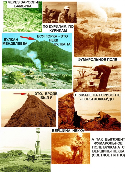 …Сам вулкан Менделеева представляет собой разрознённые участки большого (протяжённостью с полкилометра) фумарольного поля, где ещё до 2-й Мировой войны (1941-45 гг) японцы, владевшие тогда Курилами, добывали серу.