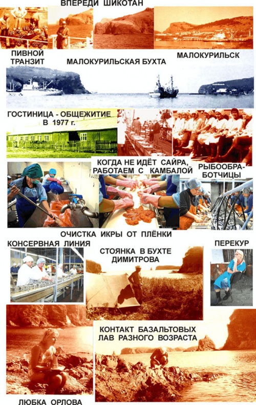 На Шикотане мне предстояли маршруты на удалённом участке ЮВ побережья острова (в районе бухты Димитрова) и требовался помощник (для записи под диктовку элементов залегания и упаковки образцов в мешочки – что ускоряло работу). Поскольку свободных помощников мужского пола на острове в августе-сентябре во время путины не бывает - все «рабочие руки заняты» (кто из серьёзных людей – мужиков - пойдёт «шарахаться» по острову, когда «пошла рыба») -, приходилось рассчитывать только на женский контингент рыбзавода. Там ещё можно было хоть что-то «выловить».