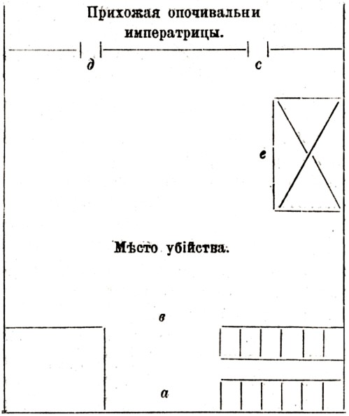 То была длинная комната, в которую входили через дверь а , и так как некоторые из стен Замка были достаточно толсты, чтобы вместить в себе внутреннюю лестницу, то в толщине стены, между дверьми а и в , и была устроена такая лестница, которая вела в апартаменты княгини Гагариной, а также графа Кутайсова. На противоположном конце кабинета была дверь с , ведшая в опочивальню Императрицы, и рядом с нею камин д ; на правой стороне стояла походная кровать Императора с , над которою всегда висели: шпага, шарф и трость Его Величества. Император всегда спал в кальсонах и в белом полотняном камзоле с рукавами.