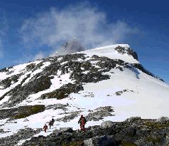 В общем, у нас были все шансы не промахнуться мимо вершины. Еще через полтора часа восхождения на ощупь и переправ через казавшиеся нам сложными (как же мы ошибались!) участки мы оказались у края какого-то ущелья. С другой стороны ущелья в тумане с трудом угадывались очертания покоряемой нами горы. Посовещавшись, мы пришли к выводу, что опять мы где-то в тумане повернули не на тот подъем и оказались на горе-соседке Мила, ненамного более низкой, почти 600 метров, но отделенной практически непреодолимой расщелиной. Пришлось возвращаться, спускаться и идти в обход, пролегавший по леднику.
