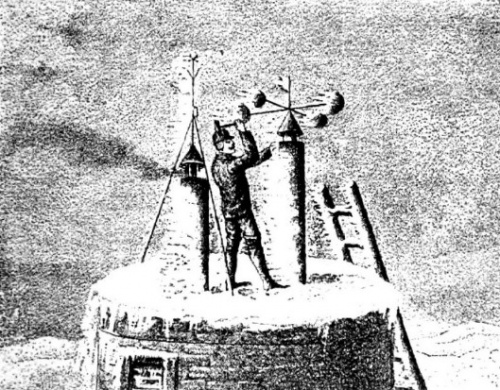 Ровно в полночь Ранкин отправился производить наблюдения. Фонарь и записную книжку он повесил на шею, чтобы обе руки были свободны. Я, конечно, сопровождал его и подивился ловкости, с которою он карабкался по обледенелым ступенькам. Такое путешествие проделывается день и ночь через два часа; невольно вспомнишь, что любовь к науке преодолевает всё. Тут пробовали устанавливать самопишущие приборы, но зимою они переставали действовать. Так живут два метеоролога, оторванные от прочего мира в продолжение целой зимы в шесть месяцев. Товарища Ранкина мне не удалось повидать: он спал в своей каморке, готовясь утром вступить на дежурство.
